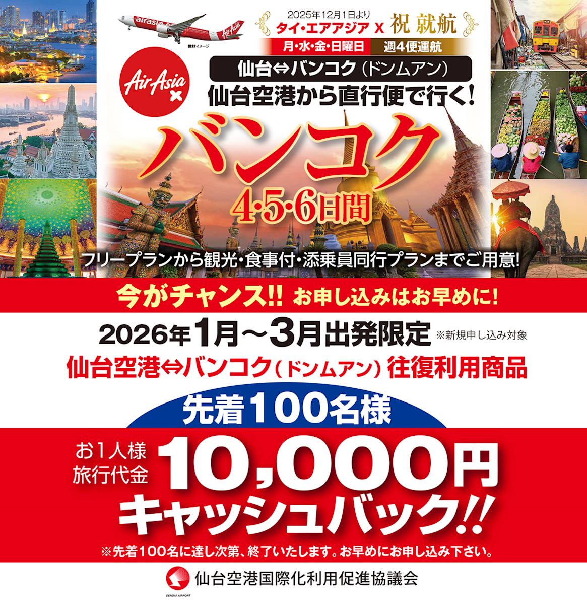 ●運航曜日:月・水・金・日 <往路>XJ631 仙台 ー バンコク(ドンムアン) 12:00発/17:30着 <復路>XJ630 バンコク(ドンムアン) ー 仙台 02:15発 /10:30着